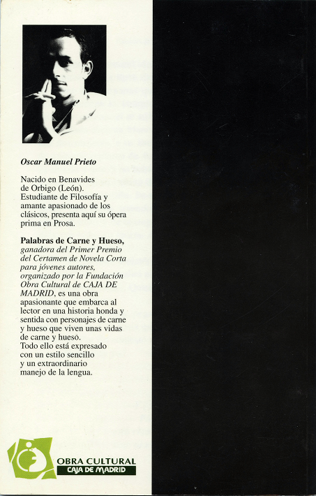 Ganadora del Primer Premio del Certamen de Novela Corta de la Obra Cultural de Caja Madrid (1995). Este debut editorial, “está marcado por un estilo sencillo y conciso, aunque su pasión por la poesía se deja notar en muchas líneas. Palabras de Carne y Hueso narra una historia fácil de seguir, incluso a través de los fascinantes saltos espacio-temporales. Con dos protagonistas, abuelo y nieto, Oscar consigue crear un universo amplio, aunque intimista, situando la acción (en forma de secuencias, de instantáneas, de escenas fotográficas) en su pueblo, Benavides de Órbigo, en Barcelona durante la Guerra Civil española y en París.